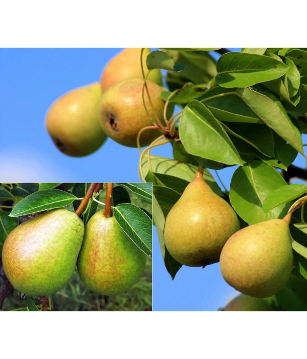 Pflanzen Sie doch gleich zweit beliebte Birnensorten in Ihren Garten. Auch wenn Sie nicht genug Platz haben, um zwei Bäume zu pflanzen, können Sie jetzt trotzdem zwei Sorten im Garten haben, die sich sogar gegenseitig befruchten können. Birnen sind eigentlich selbststerile Pflanzen, doch durch das Zusammenfügen der beiden Sorten auf einem Baum, ist keine zweite Pflanze nötig. ‚Vereinsdechant‘ überzeugt durch sehr große, graugrüne Früchte mit süßem Geschmack. Die gelbweißen Früchte sind sehr saftig und besitzen ein leichtes Säurearoma. Die Birnen der ‚Williams Christ‘ sind glockenförmig, goldgelb und groß. Die gelbweißen Früchte sind zart schmelzend und saftig, sie verfügen über einen süßen Geschmack mit einem kräftigen, intensiven Aroma. Die Erntezeit der Sorten liegt zwischen September und Oktober. Die Birnen eignen sich für den Frischverzehr, aber auch zum Verarbeiten. ‚Williams Christ‘ ist eine sehr bekannte Sorte zum Schnaps brennen. ‚Vereinsdechant‘ können Sie für alle möglichen Süßspeisen oder Marmeladen benutzen. Mit diesen beiden Sorten haben Sie die perfekte Kombination aus leckeren Birnen.