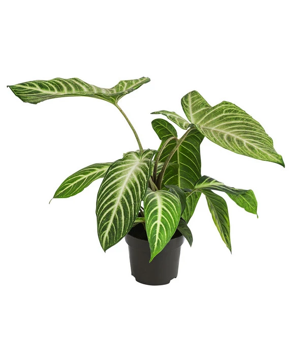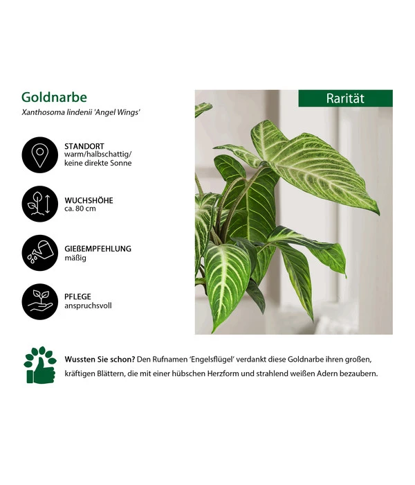 Sie lieben außergewöhnliche Zimmerpflanzen, die auffallen und ein wunderschönes Muster haben? Dann werden Sie die Goldnarbe, auch als Xanthosoma lindenii oder Caladium lindenii bekannt, garantiert lieben. Dieses Exemplar trägt den Namen ‚Angel Wings‘ und das aus gutem Grund: mit etwas Fantasie erinnern die großen Blätter der Zimmerpflanze tatsächlich an die Flügel von Engeln. Doch selbst wenn Sie diese Ähnlichkeit nicht sehen, wird die Goldnarbe Sie begeistern, denn sie hat unverwechselbare, herzförmige Blätter mit einer markanten Zeichnung. Rund um die Blattadern ist das Laub der Blattschmuckpflanze heller gefärbt, sodass es fast aussieht, als seien die Blätter gestreift. Besonders gut zur Geltung kommt die Musterung dank der Blattform: die Goldnarbe trägt längliche, leicht gewellte Blätter, die mit zunehmendem Alter der Pflanze wunderbar groß werden können und somit zwischen anderen Zimmerpflanzen sofort auffallen. Wenn Sie also auf der Suche nach einer besonderen Rarität oder einem schönen Blickfang sind, sind Sie bei der Goldnarbe goldrichtig.