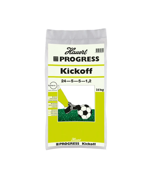 Sie möchten, dass Ihr Rasen ein makelloses Schmuckstück ist – dicht und sattgrün – und dass Ihr schönes Grün gleichzeitig auch als strapazierfähige Spielwiese für die Kinder dient. Aber wenn Sie nach einem harten, langen Winter aus dem Fenster gucken, ist der Rasen oft eher ein kläglicher Anblick. Glück hat, wer den Hauert Progress Kickoff Rasendünger kennt. Diese Fitness-Kur für strapazierte Rasenflächen wird nicht nur in Hausgärten eingesetzt, sondern findet auch auf Fußballfeldern, Golfplätzen und öffentlichen Grünflächen Verwendung. Der Hauert Progress Kickoff Rasendünger 24+5+5 enthält zusätzlich Magnesium und wichtige Spurenelemente. Der hohe Stickstoffanteil setzt sich aus verschieden wirksamen Stickstoff-Formen zusammen, so dass eine zügige Startwirkung erreicht wird, aber zugleich eine gleichmäßige Langzeitwirkung über einen Zeitraum bis zu 120 Tagen gewährleistet ist. Der Progress Kickoff Rasendünger ist so konzipiert, dass er auch bei kühler Witterung wirkt und durch die spezielle Umhüllung Auswaschungsverluste minimiert werden.