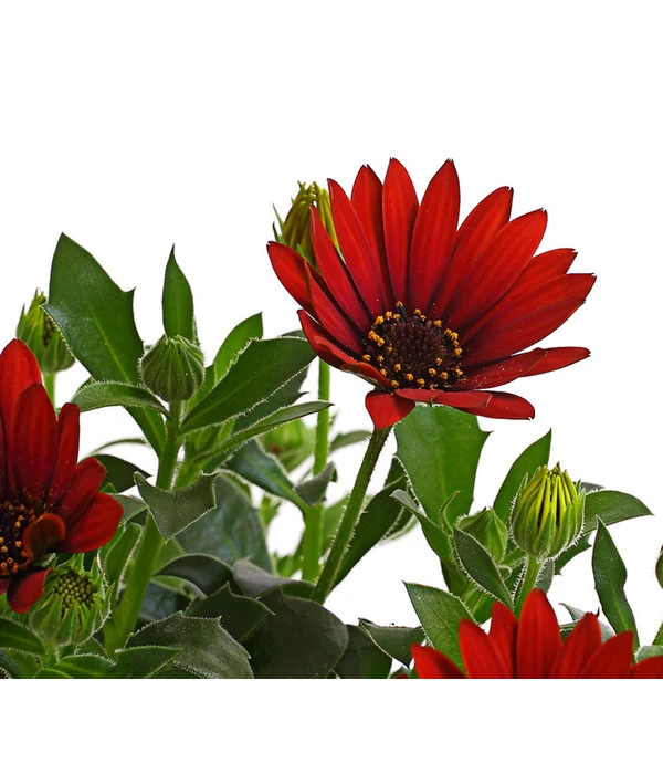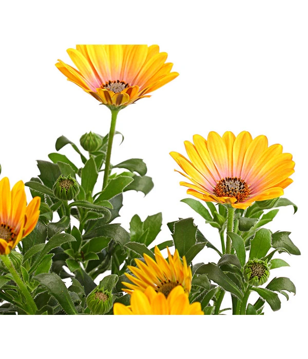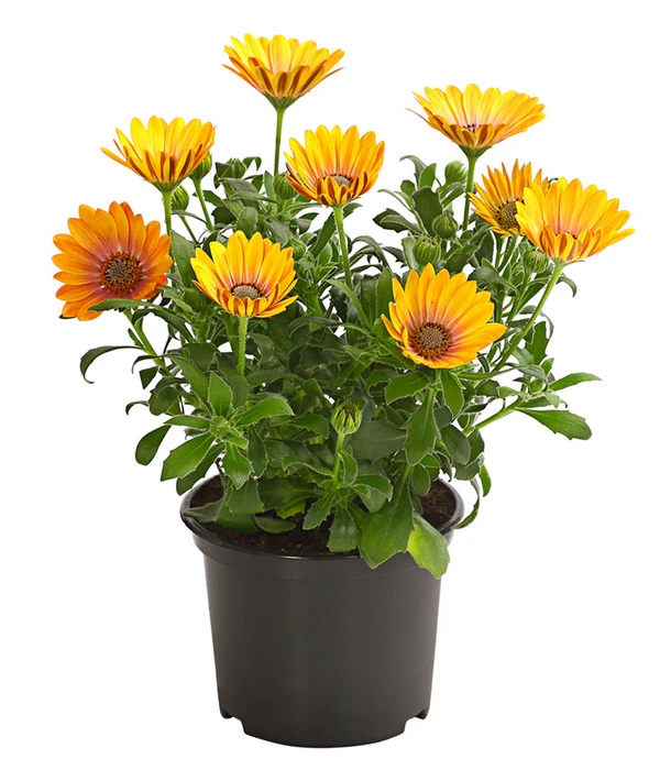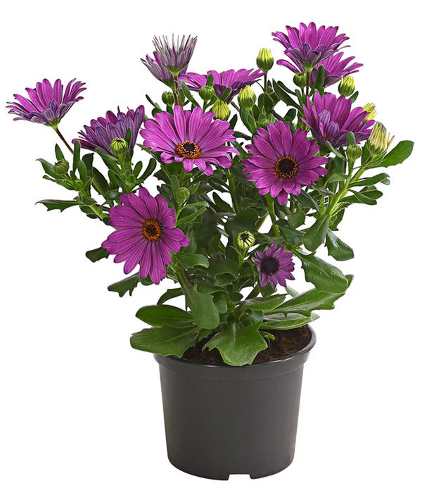 Suchen Sie auch immer wieder nach schönem Tischschmuck für Ihre Gartenparty? Gleichfarbige Kapkörbchen in einfachen Übertöpfen sind hübsche Hingucker. Darin halten sie es, bei etwas Fürsorge, auch tapfer aus, so lange die Gefäße nicht voll Wasser laufen. Mit ihrem kompakten, buschigen Wuchs passen Kapkörbchen sowohl in Beete als auch in Balkongefäße. Sie bestechen mit Einzelstellung, sind aber zudem ausgesprochen kombistark. Sie gesellen sich gerne zu Minihängepetunien, Geranien, zu Männertreu, Husarenknop und Vanilleblume. Gut geeignet sind die Osteospermum auch für Friedhöfe, auf dem Grab lenkt sie mit ihren heiteren Margeritenblüten die Gedanken in lichtere Bahnen.