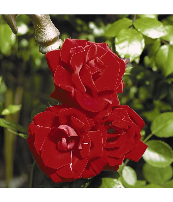Stolz entfaltet sie ihre prächtigen, feurig roten Blüten und ist sich dabei der Aufmerksamkeit aller sicher. Die Kletterrose ‚Santana®‘ ist, da sind sich viele Rosenkenner einig, eine der besten rotblühenden Kletterrosensorten in Europa. Die großen Knospen erblühen fortlaufend zu gefüllten, leuchtend roten Blüten, die sich von der üppigen, lederartigen Belaubung dekorativ abheben. Die Sorte verzweigt sich sehr gut von unten, so dass Kahlstellen im Sichtbereich vermeidbar sind. Neben dem hohen Zierwert macht auch die gute Widerstandsfähigkeit gegen die typischen Rosenkrankheiten diese Rose zur ersten Wahl für viele Gärtner. Mit ihrer Wuchshöhe von 250-350 cm ist sie ein höchst dekorativer Sommerschmuck für Sichtschutzwände, Rankgitter und Rosenbögen.