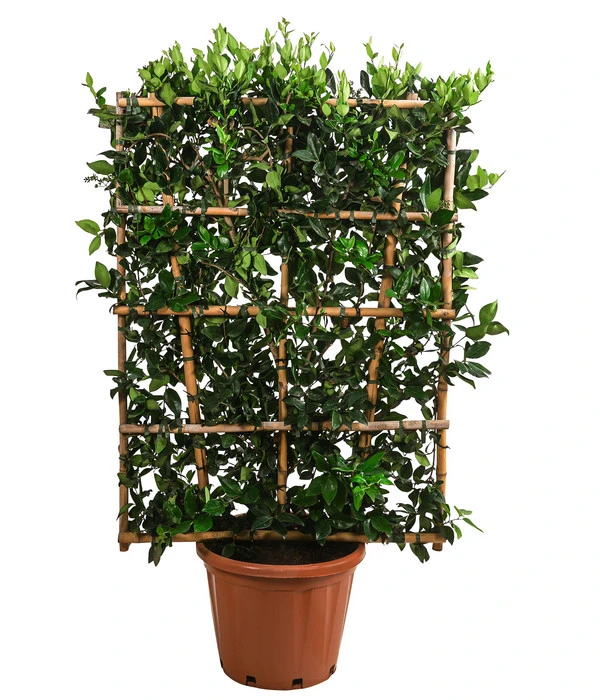 Abertausende von dunkelgrünen, glänzenden kleinen Blättern, die eine dichte, blickdichte Sichtschutzhecke bilden – davon träumen Sie? Und zwar von einer Hecke, die ganz schnell hoch und dicht ist? Dann nehmen Sie den Liguster ‘Texanum‘! Dieser hat schon eine ansehnliche Höhe von 150-160 cm erreicht und außerdem haben wir ihn am Spalier kultiviert, sodass Sie ihn sofort nach dem Kauf als Abgrenzung nutzen können. Die kräftige, wuchsfreudige Pflanze wird schnell in die Höhe und in die Breite wachsen, sodass Sie schon in kurzer Zeit die gewünschte grüne Sichtschutzwand haben. Und die Liguster ‘Texanum‘ gehört sogar zu den sogenannten wintergrünen Pflanzen, die ihr Laub erst im Frühling zum Neuaustrieb der frischen Blätter abwerfen. Im Sommer wird Sie das attraktive Ziergehölz außerdem mit weißen, rispenförmigen Blüten erfreuen, die einen angenehmen Duft im Garten verbreiten. Entscheiden Sie sich für den Liguster ‘Texanum‘ – er wird Sie nicht enttäuschen!