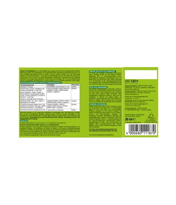 PROTECT GARDEN Schädlingsfrei Lizetan® AZ ist ein hochwertiges Konzentrat, aus dem Sie ein Gieß- oder Spritzmittel herstellen können. Mischen Sie 3-6 ml Konzentrat pro 1 l Wasser, wenn Sie das Mittel spritzen möchten, für Gießwasser nehmen Sie 15 ml pro 3 l Gießwasser. Verwenden Sie Schädlingsmittel immer mit Bedacht und beachten Sie die Wartezeiten, bevor Sie Ihre • Gurken, • Zucchini, • Auberginen, • Tomaten, • Kartoffeln und • Kräuter ernten und zubereiten.