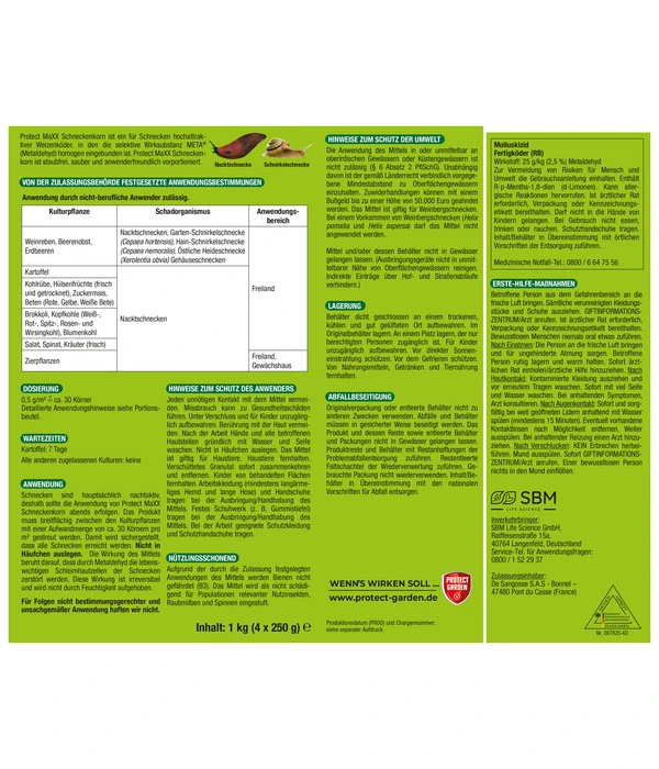 Das PROTECT GARDEN Schneckenkorn Maxx ist ein für Schnecken hochattraktiver Weizenköder, in den die selektive Substanz MET® (Metaldehyd) homogen eingebunden ist. Deshalb üben die Körner eine so unwiderstehliche Lockwirkung auf die gefräßigen Schnecken aus, dass sie die Körner sogar Ihren zarten Salatblättern vorziehen. Und dann wird das PROTECT GARDEN Schneckenkorn Maxx den Schnecken den Appetit auf Ihre Gartenpflanzen gründlich verderben. Natürlich sind die Körner regenfest und schimmeln nicht, so dass Sie das Mittel auch während anhaltend feuchter Witterung verwenden können, die ja gerade bei den gefürchteten Schnecken so beliebt ist.