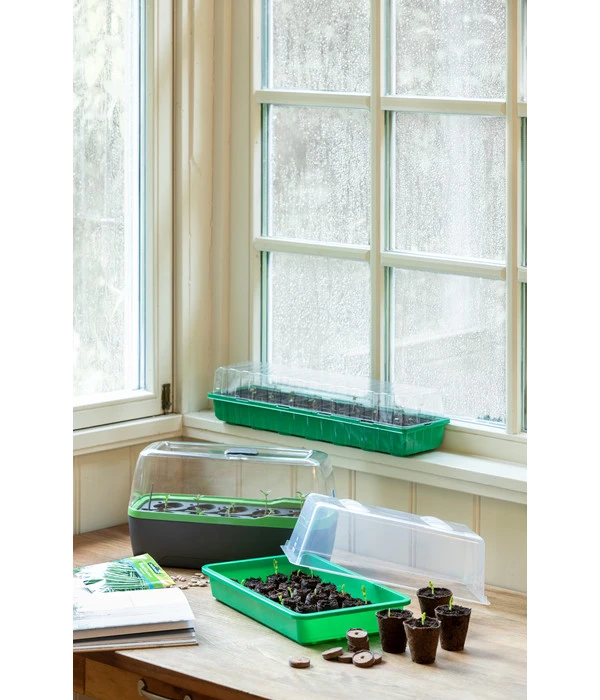 Sie wollen in Ihrem Innenraum einen Ort mit idealen Bedingungen für die Anzucht von Blumen, Kräutern oder Gemüse schaffen? Hier bietet sich das Zimmergewächshaus aus dem Hause Romberg optimal an. Sein Ventilationssystem mit Belüftungslöchern und Schiebereglern in der Haube sorgt für ein ideales Klima, in dem Ihre Gewächse wundervoll gedeihen. Dadurch gestaltet sich die Anzucht mit diesem kleinen Gewächshaus kinderleicht. Platzieren Sie einfach Kokos-Quelltabletten oder Anzuchttöpfe in seine Vertiefungen und schon kann die Aussaat von aromatischen Kräutern oder leckerem Gemüse beginnen. Aber auch zur Unterbringung von kleineren Pflanzen, die ein geschütztes Klima brauchen, eignet sich die Vorrichtung hervorragend.