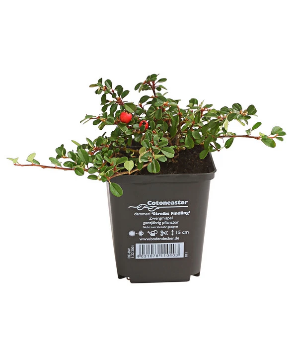 Die Zwergmispel ‚Streibs Findling‘ ist die niedrigste unter den verschiedenen Cotoneaster-Sorten. Sie erreicht nur eine maximale Wuchshöhe von 15 cm und eignet sich deshalb perfekt zur Begrünung vor allem kleiner Flächen. Profi- wie Hobbygärtner sind echte Fans dieser Gartenpflanze, denn sie begeistert mit den gleichen guten Eigenschaften wie ihre größeren Schwestern. Das bedeutet: Erstens ist die Zwergmispel immergrün und ihre kleinen Blätter zeigen ein glänzendes Tiefgrün. Zweitens schmückt sich der Zwergstrauch in den Monaten Mai und Juni mit einer Fülle kleiner, weißer Blüten, die eine beliebte Bienenweide sind. Im Spätsommer reifen dann kleine, hellrote Beeren an den Zweigen, die bis ins Frühjahr leuchtende Akzente setzen, wenn sie nicht im Winter von den heimischen Vögeln genascht werden. Und obwohl diese kleine Kriechmispel ihre Blätter ganzjährig behält, eifert sie im Herbst doch den laubabwerfenden Gehölzen nach und färbt ihre Blätter in prächtigen Gelb- und Orange-/Rottönen.